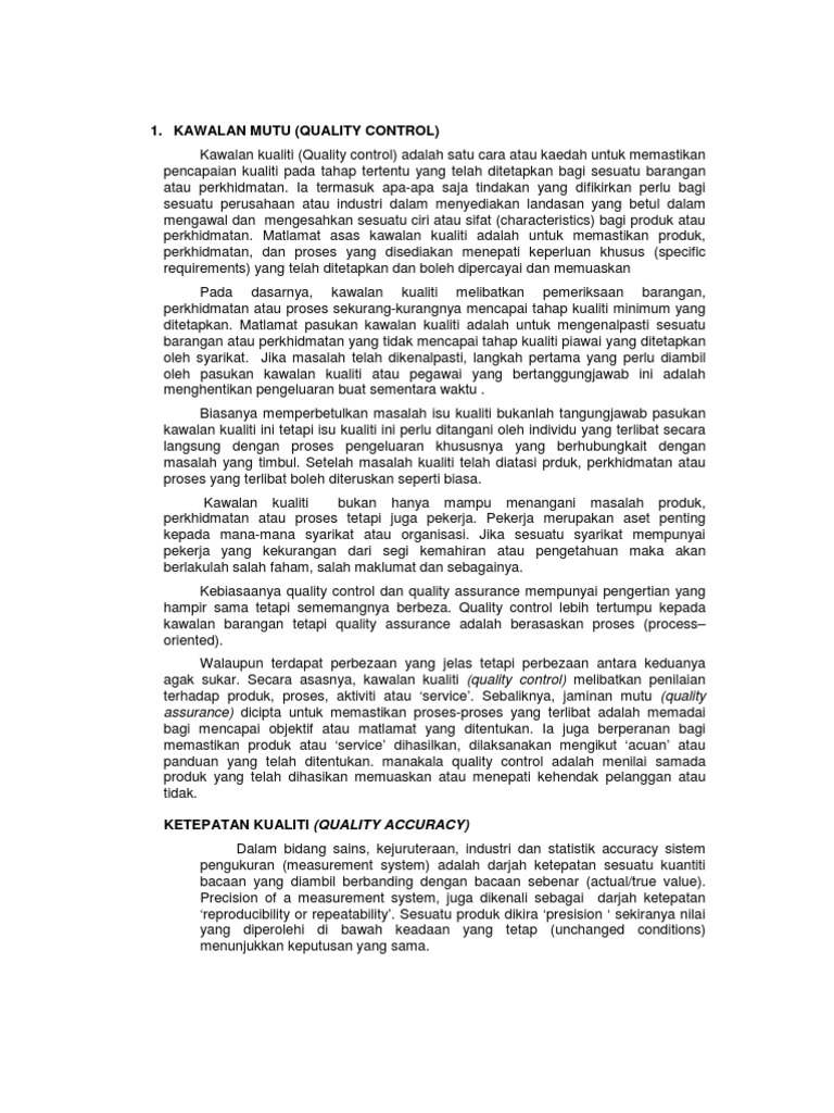 Pengenalan Kawalan Kualiti from imgv2-2-f.scribdassets.com Kawalan lancar ini membolehkan kami untuk bertindak balas terhadap sebarang ketidakkonsistenan, untuk mengoptimumkan proses pengeluaran kami dan untuk menjamin kualiti yang tinggi secara konsisten dalam bahan strapping kami. Memastikan keperluan dan kehendak pengguna dipenuhi soalan (d) menghendaki calon untuk menerangkan tiga langkah pertama dalam proses kawalan kualiti. 1.1 penggunaan plastik dalam industri pengeluaran 1.2 objektif disertasi 1.3 format disertasi bab2 pengacuansuntdkan 2.1 pengenalan dan sejarah kepada perindustrian plastik 2.2 penjelasan am proses pengacuan suntikan 2.3 kawalan proses bab 3 rekabentuk ujikaji (design of experiment) 3.1 peranan rekabentuk ujikaji 3.2 prinsip asas Ialah mengurangkan kos dan meningkatkan kualiti. Pelbagai sistem kualiti diwujudkan dalam organisasi pengeluaran masa kini seperti total quality management. Penganjuran pembuatan produk, dalam kebanyakan kes, melibatkan pelaksanaan jabatan yang bertanggungjawab menjadi dari pelbagai jenis kawalan produk. Kaedah, jenis dan kawalan kualiti. Kaedah pemeriksaan kaedah yang perlu digunakan dan prosedur yang perlu diikuti semasa melakukan pemeriksaan 4.